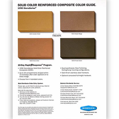 The SierraSeries® 1090 from Bobrick boasts a scratch, dent, and impact-resistant system in a variety of solid colors that are clear through the composite material. Three mounting configurations suit any application.